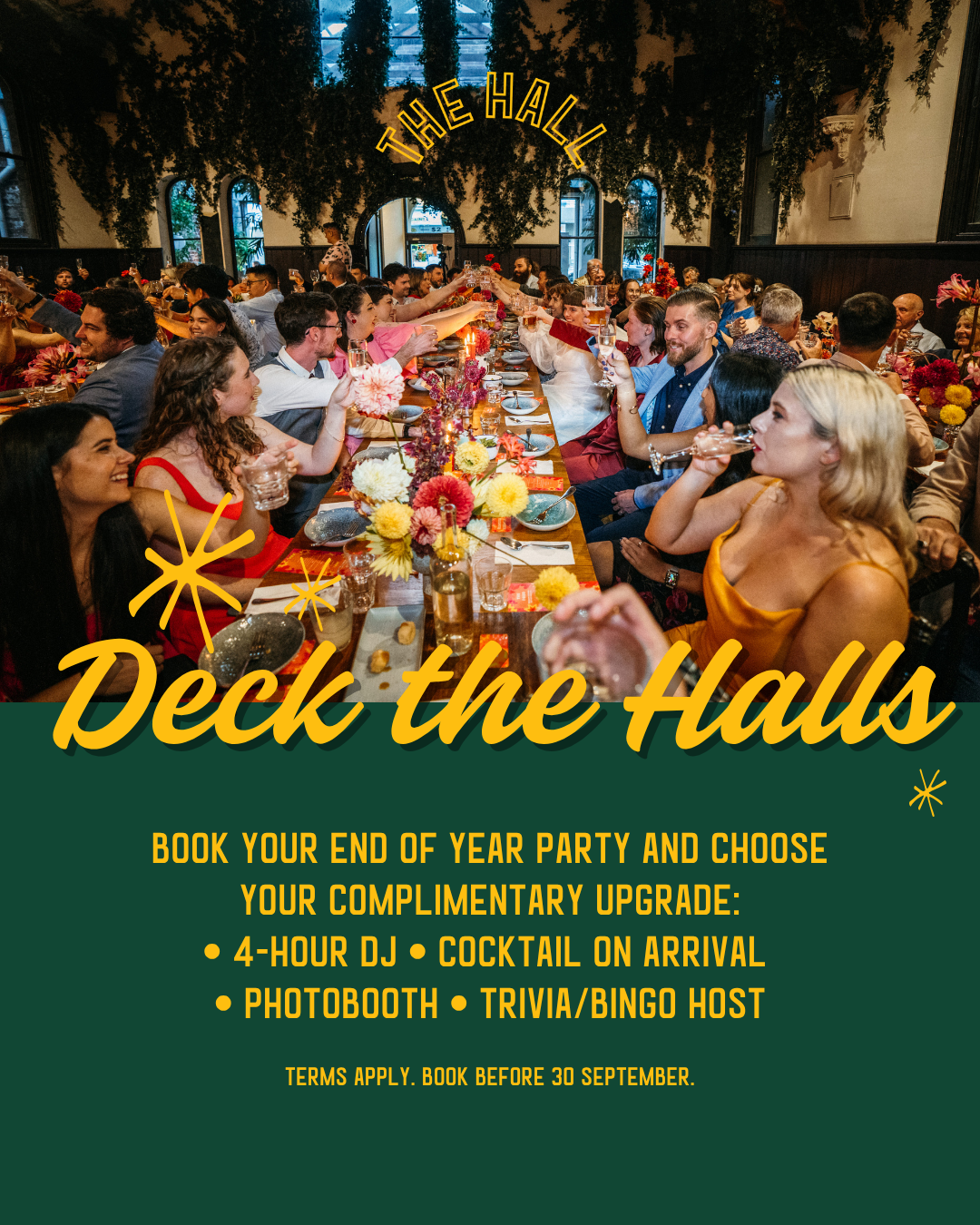 *Terms and conditions apply: minimum guest numbers apply. subject to availability. DECK THE HALLS PROMO